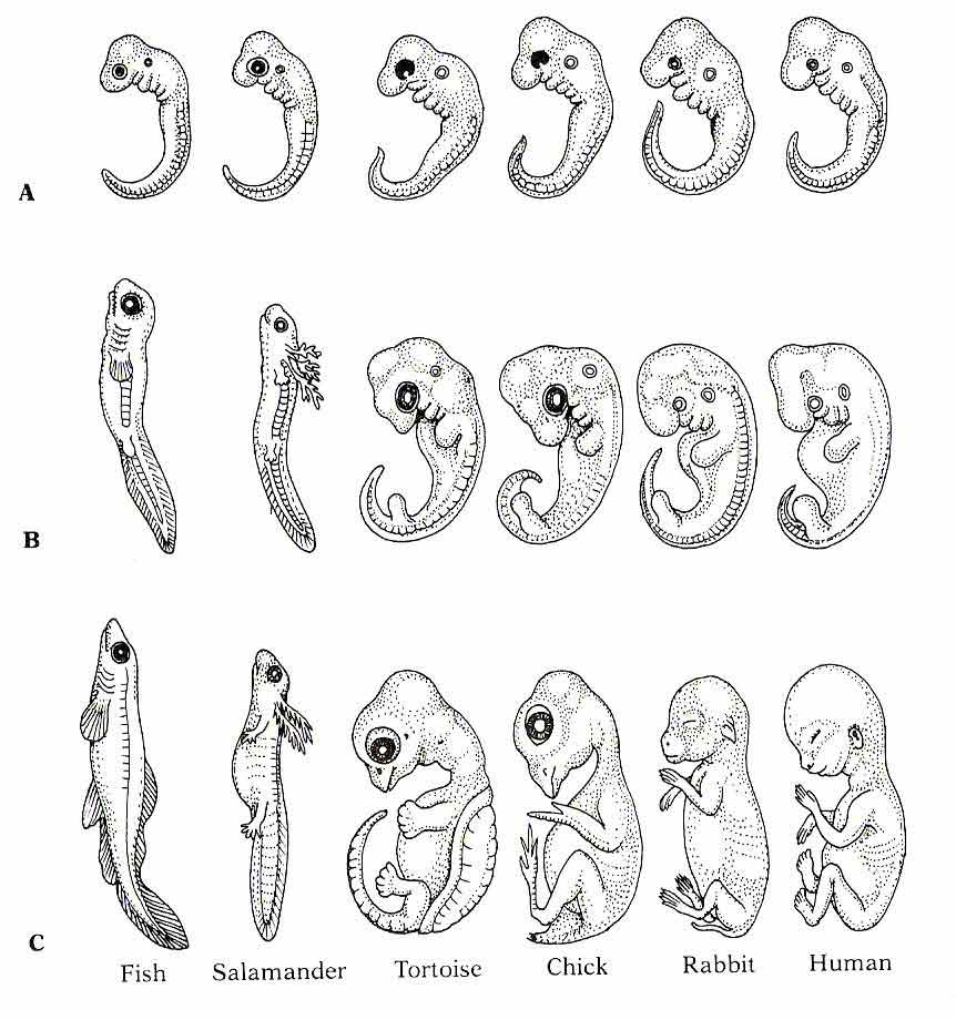 - Darwin’s theory of evolution noted that all vertebrates have gill slits and tails in the early stages of embryo formation even though these features may be lost or modified in the adult-form phenotype.