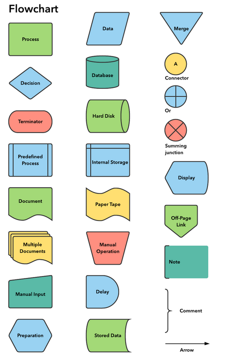The shapes all represent a specific action. In a flowchart, the shape is important. The key is shown below: