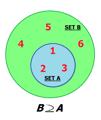 If every member of A is also present in B, then A is a subset of B. This relationship is also represented as: