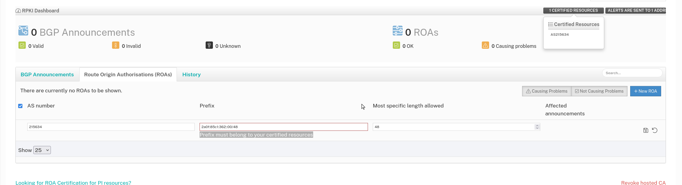 - So I had got my BGP routing working now - whoopie. However, Frantech had now informed me that as my prefixes were not RPKI signed that Stallion (their control panel) would not whitelist me.