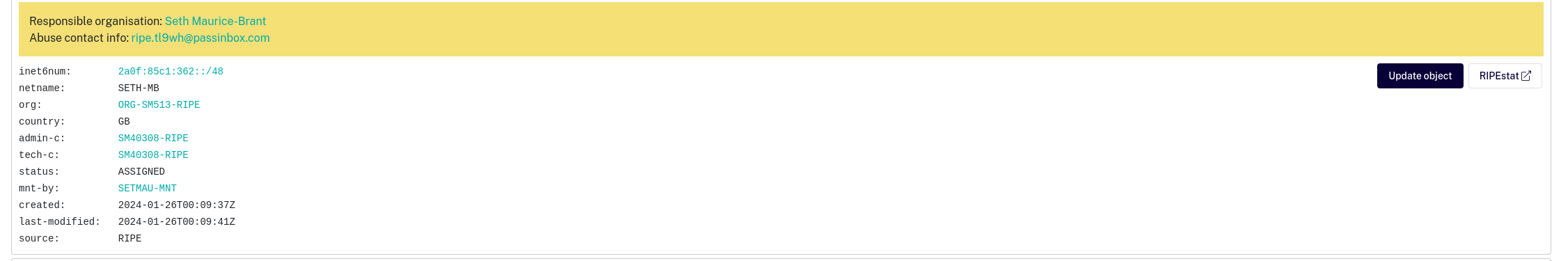 - Before applying, I made some objects on the RIPE database. This is documented alongside the rest of my RIPE objects further down.
