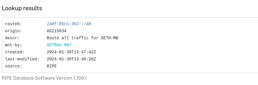 - Lagrange then submitted an application to the RIPE NCC on my behalf, who approved my request for an ASN and an IPv6 (PA) block within a couple of days.