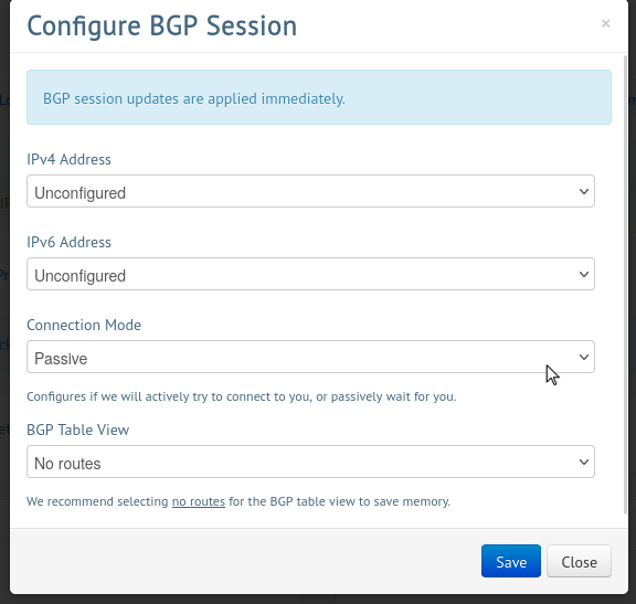- This needed me to set the IP addresses to my server IPs in order for BGP requests from my server to be accepted. D’uh!