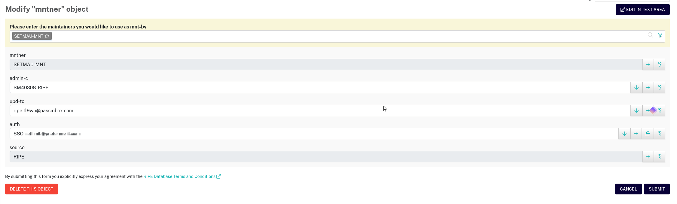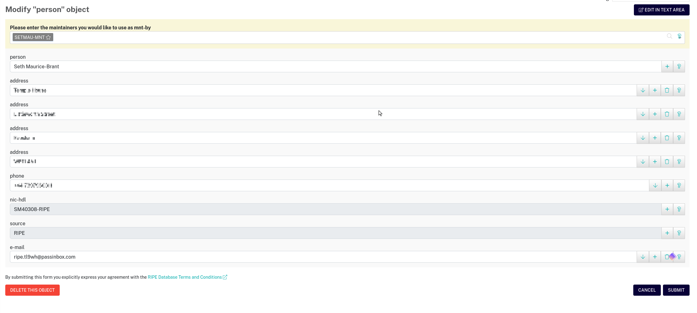 MAINTAINERand aPERSONpair. - This is required to do anything useful with the RIPE database.